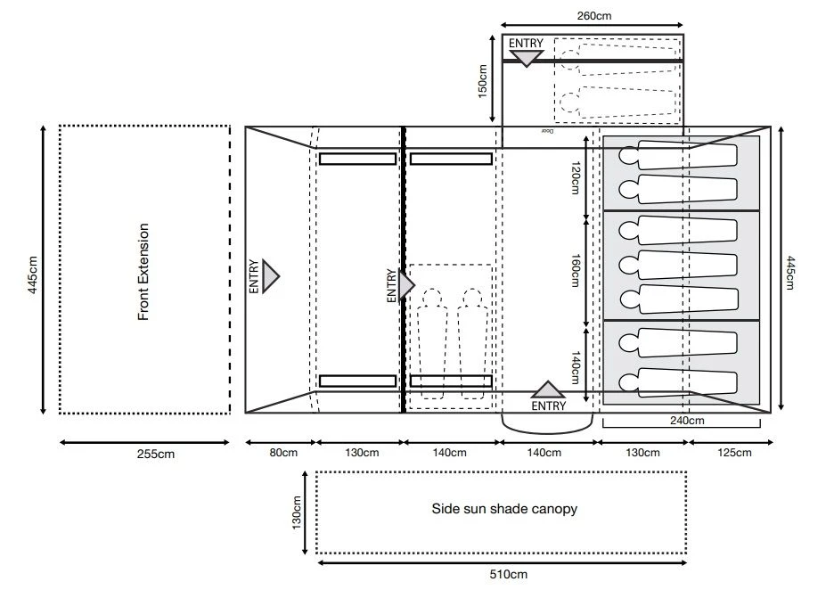 A maximum sleeping capacity of eleven can be reached should you choose to purchase a secondary optional two-berth inner tent. The parallel design of this porch area means that only a fraction of extra space is utilized at the side of the family tent.